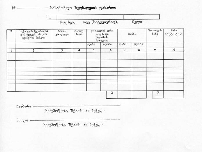 ი) ადგილზე მიტანა და მყიდველისათვის ან ტვირთის მიმღებისათვის ჩაბარება ფიქსირდება ზედნადების ქვედა მარჯვენა მხარეს გამოყოფილ სტრიქონებზე, ჩაბარებული ტვირთის ფაქტობრივი ოდენობისა და ოპერაციის განხორციელების დღის აღნიშვნით, ჩამბარებლის ხელმოწერით, ტვირთის მიმღების შტამპით ან ბეჭდით (მათი არსებობის შემთხვევაში) და უფლებამოსილი პირის თანამდებობის, სახელისა და გვარის ჩვენებით;