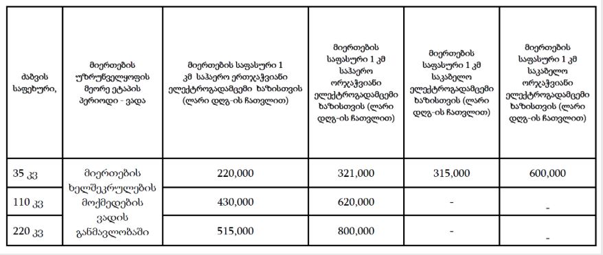 * შენიშვნა: გადაცემის ლიცენზიატის გადამცემ ხაზში შეჭრის შემთხვევაში ელექტროენერგიის გადამცემ ქსელზე მიერთების მეორე ეტაპის საფასური შედგება დანართში №12 არსებული შესაბამისი ძაბვისა და სიგრძის ელექტროგადამცემი ხაზისა და დანართში №11 არსებული საფასურის ჯამისგან. “. |